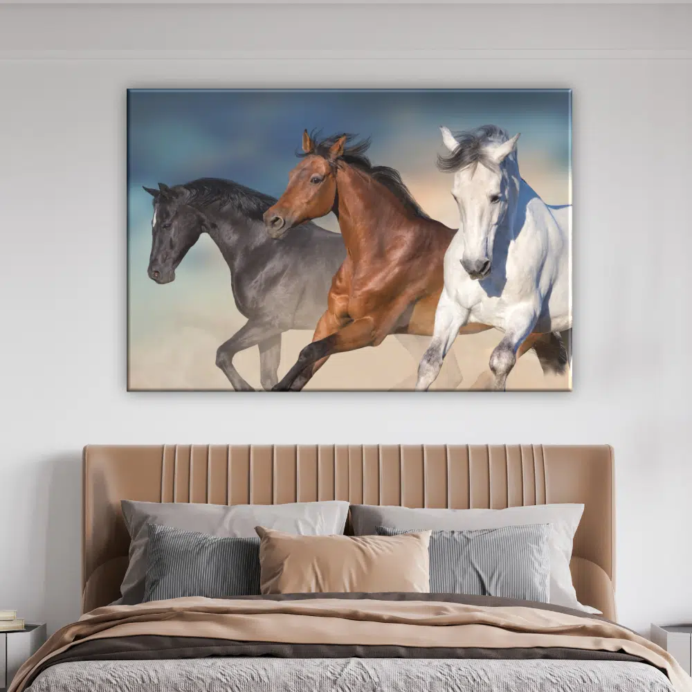 Estos 3 caballos galopando en la naturaleza darán a tu hogar un efecto de espíritu libre. Sus crines al viento, sus carruras y sus abrigos no harán más que decorar perfectamente su interior.