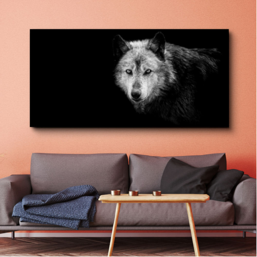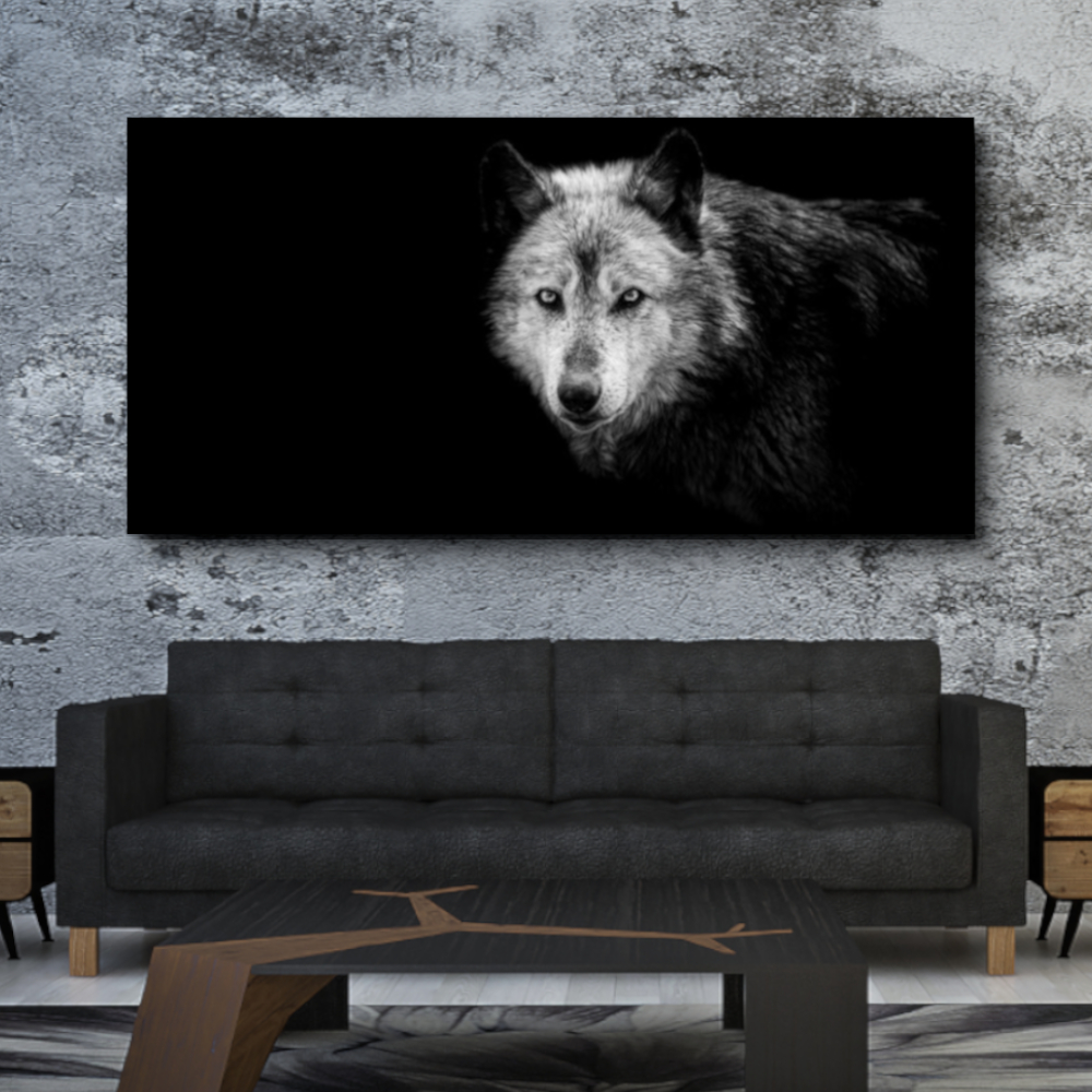 Este cuadro Lobo en blanco y negro capta la atención en todo momento. De hecho, su aspecto te hipnotiza para que te sientas seguro. El lobo, con su instinto protector, le aporta seguridad y confort. Este cuadro es la elección adecuada si buscas un regalo para los apasionados de los lobos o los animales.