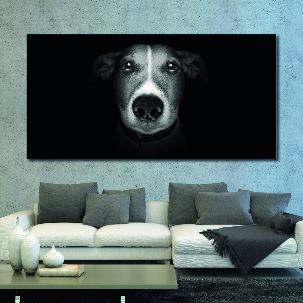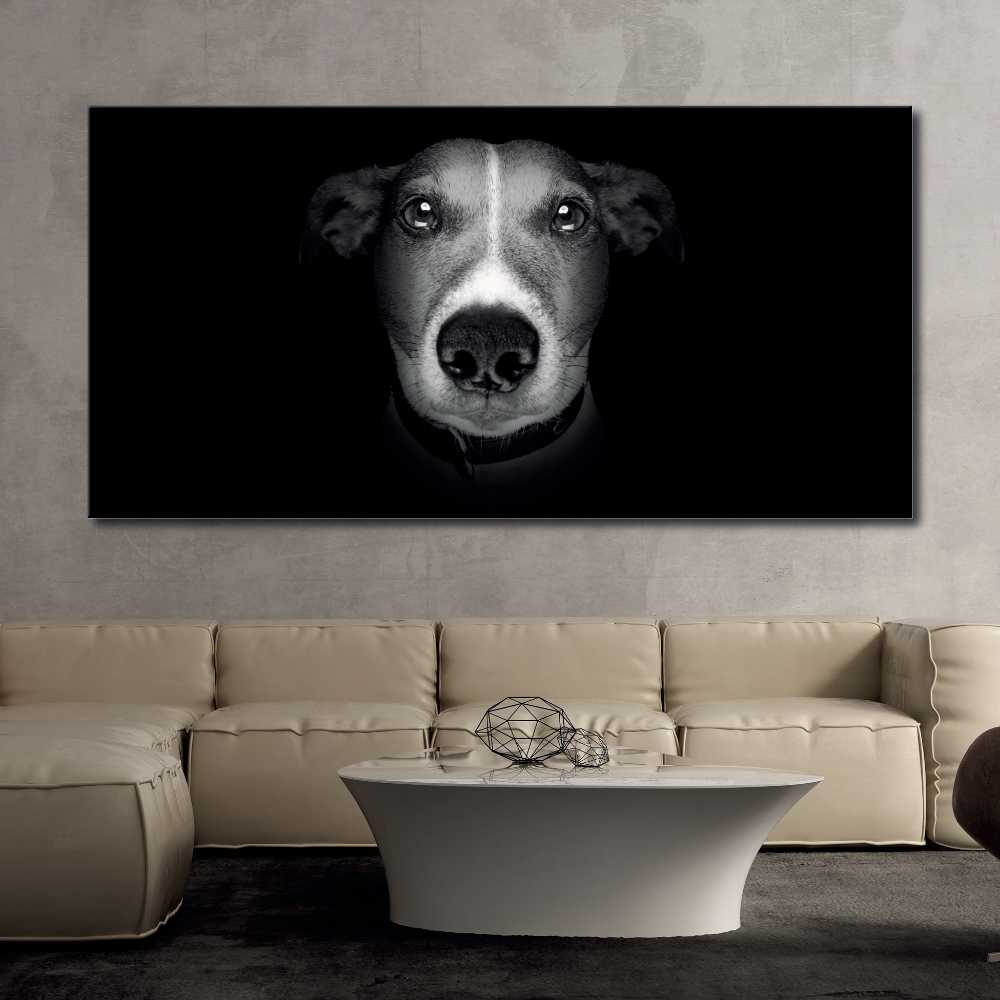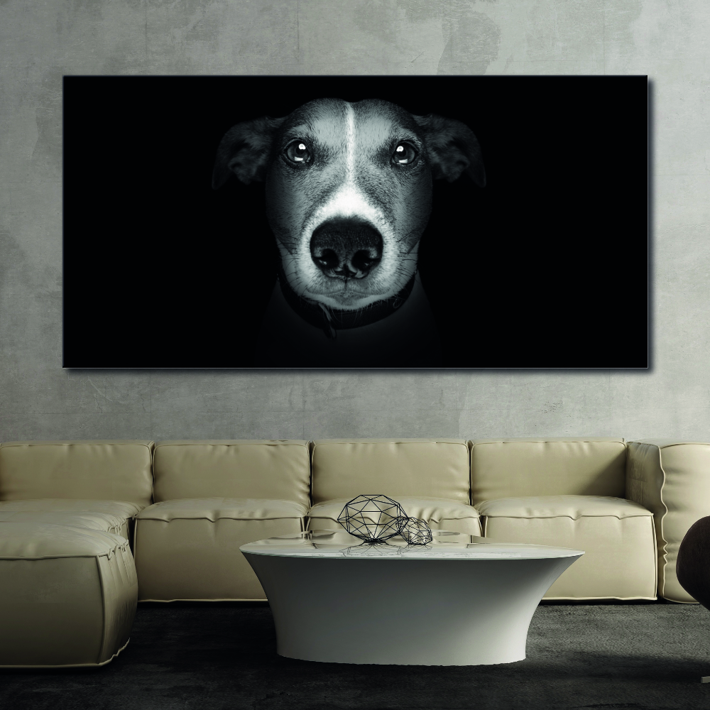Si te apetece sacudir el ambiente tradicional de tu decoración, este potente cuadro de salón moderno con su tema de cabeza de perro muy cercana, y su contraste de colores será ideal para ello.