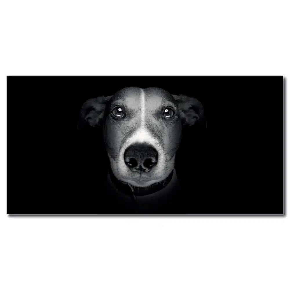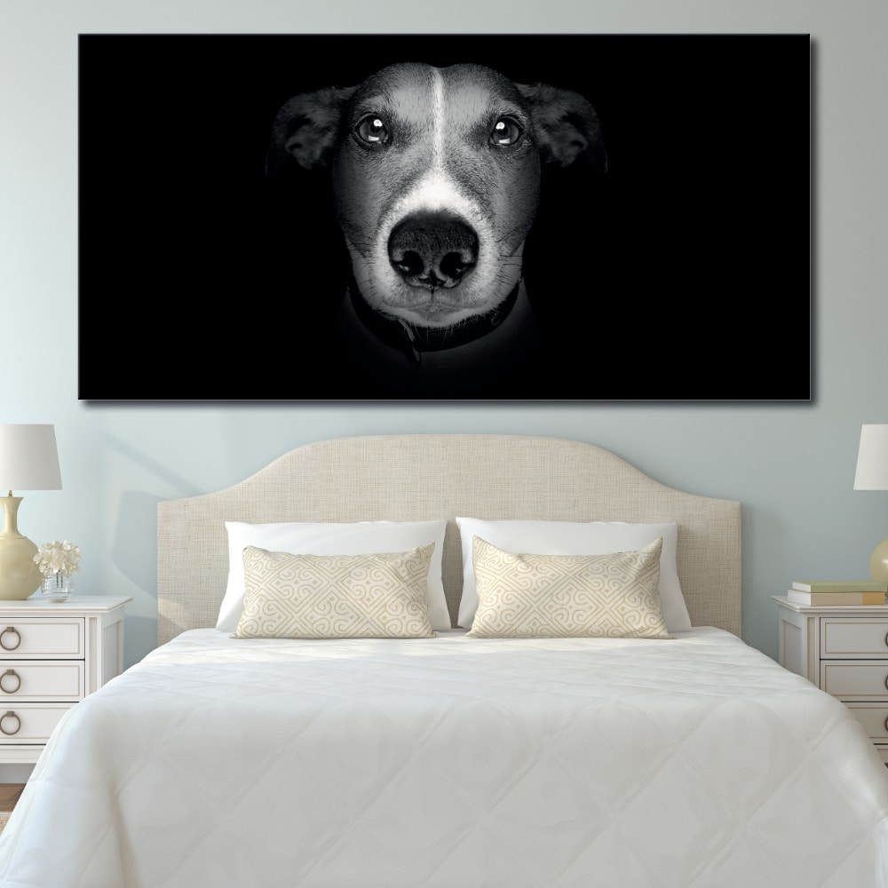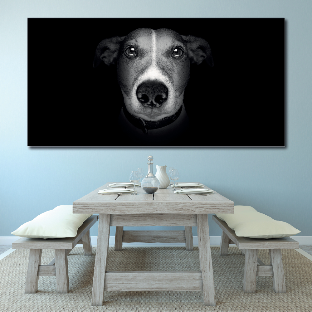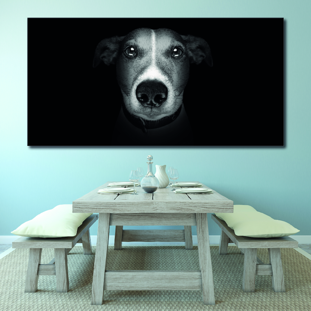Si te apetece sacudir el ambiente tradicional de tu decoración, este potente cuadro de salón moderno con su tema de cabeza de perro muy cercana, y su contraste de colores será ideal para ello.