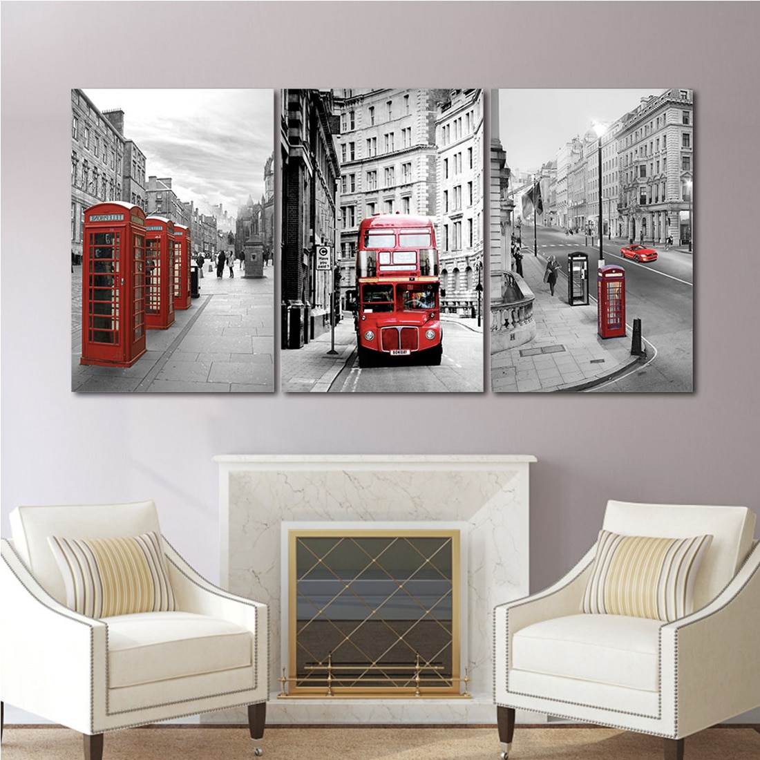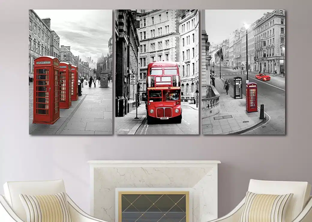 Este precioso y moderno cuadro de salón presenta figuras icónicas de la ciudad de Londres dejándolas en rojo sobre un fondo blanco y negro.