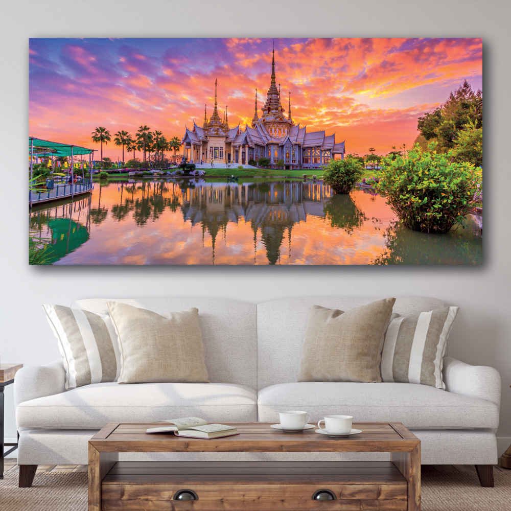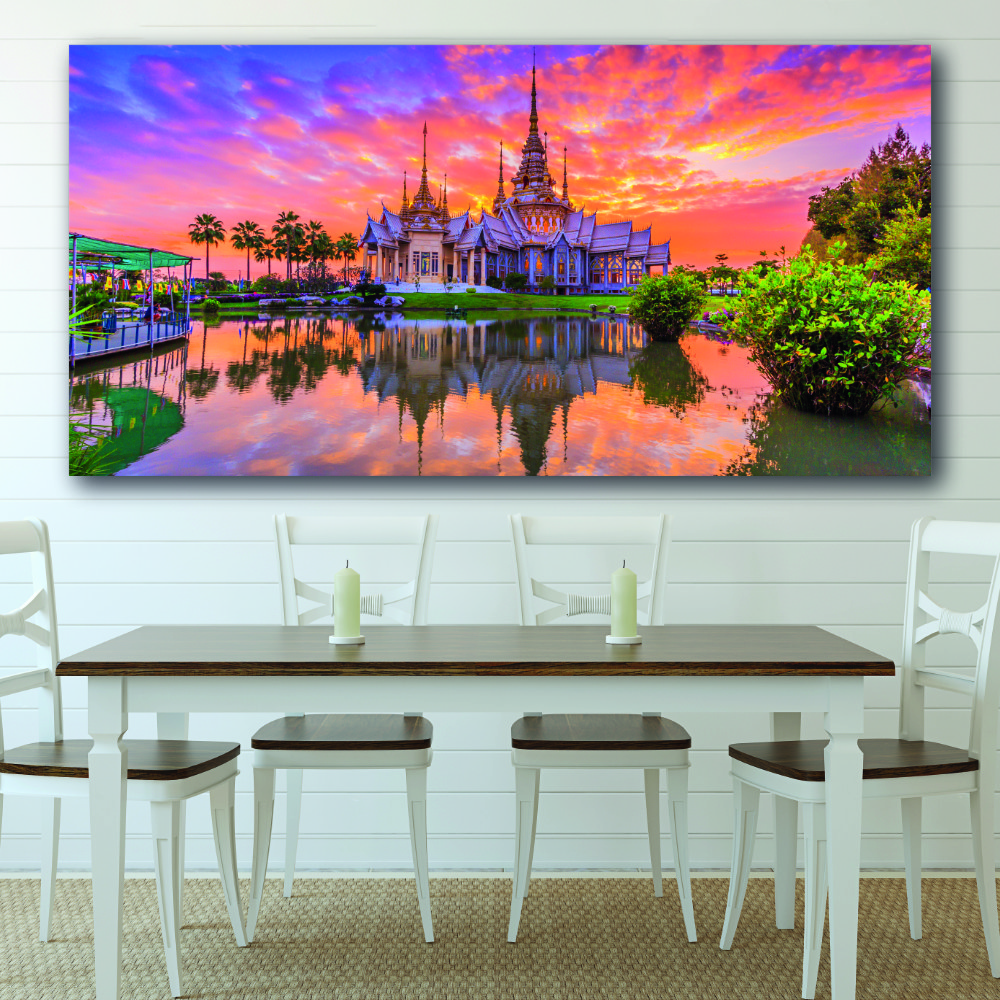 Con miles de templos en Tailandia, este moderno cuadro de salón es una buena representación de la omnipresente arquitectura del país. La sofisticación de la arquitectura y los colores desprenden una sensación de serenidad y espiritualidad. Este moderno cuadro de templo tailandés sorprenderá a sus invitados.