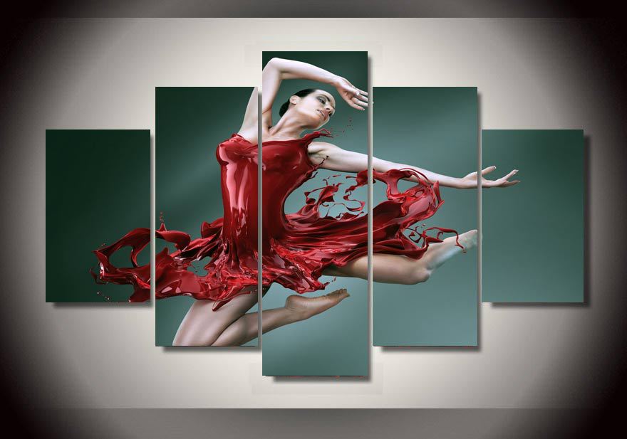 Una elegante bailarina en un eterno salto. Un vestido rojo que le queda perfecto y que destaca sobre el blanco de su piel. Exponga esta obra de arte en su casa.