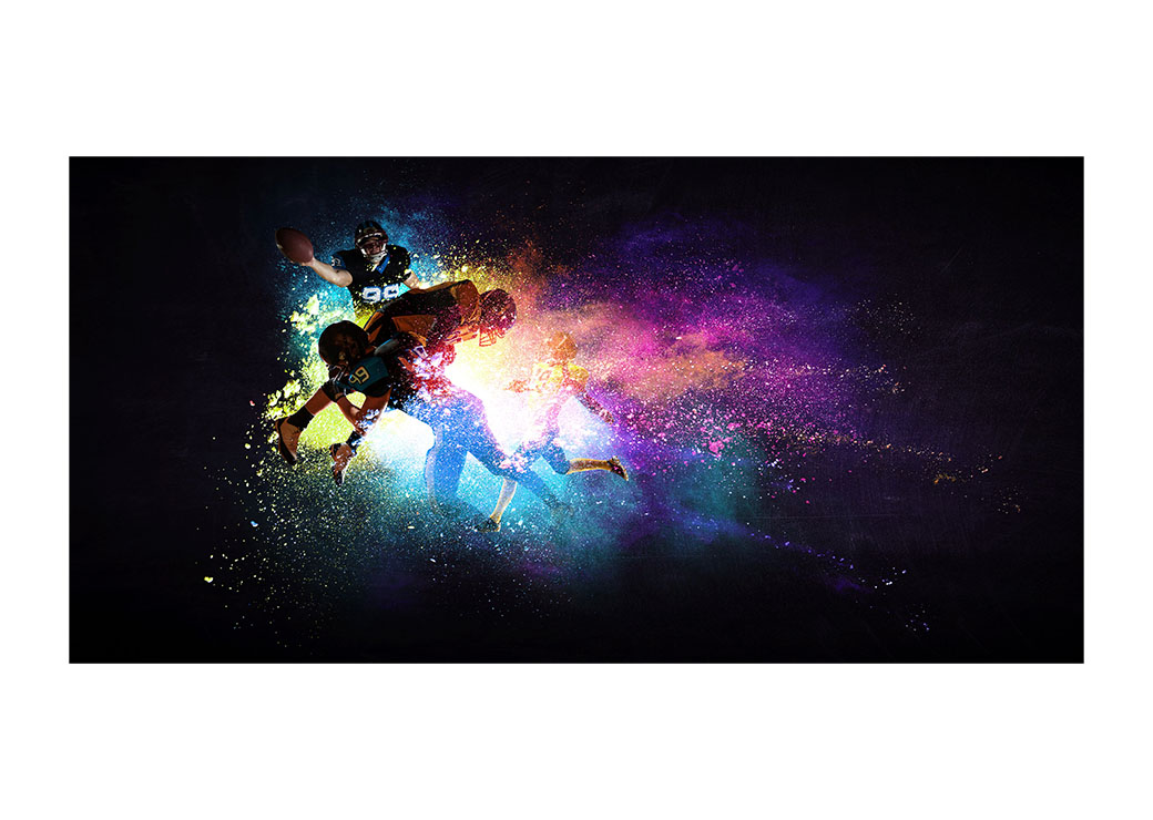 El fútbol americano es un deporte de contacto. Los jugadores están equipados con múltiples equipos de protección porque las colisiones son muy comunes. Este moderno cuadro de salón representa perfectamente una colisión entre varios jugadores en plena acción.