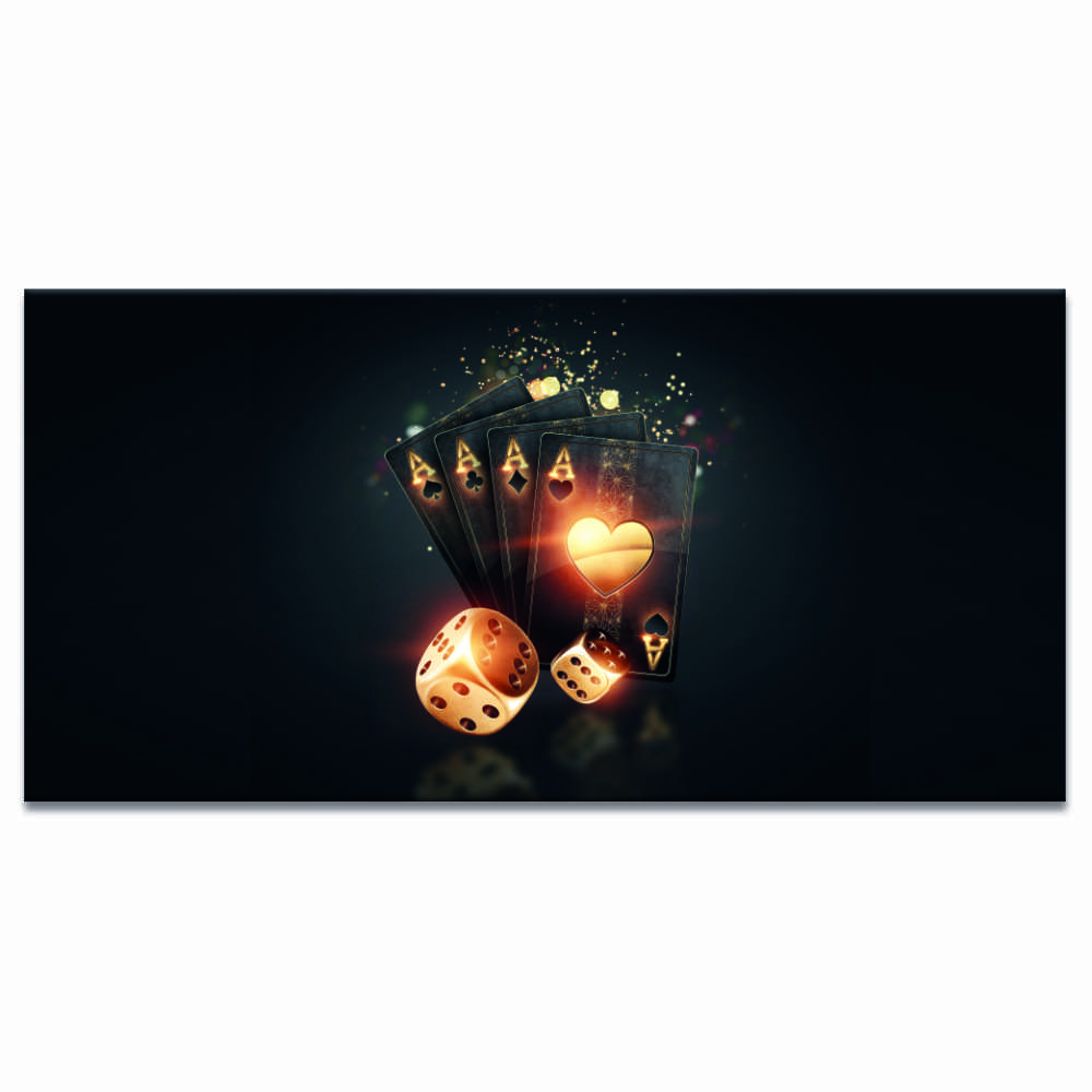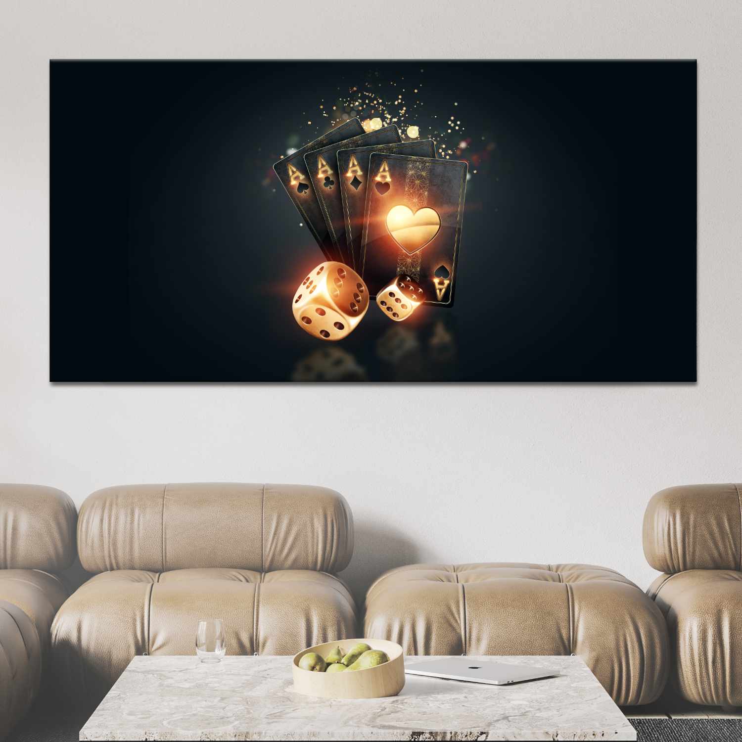 En colores negro y dorado, este moderno cuadro de salón representa un cuatro de ases, la segunda combinación más fuerte y rara de obtener en el póker.