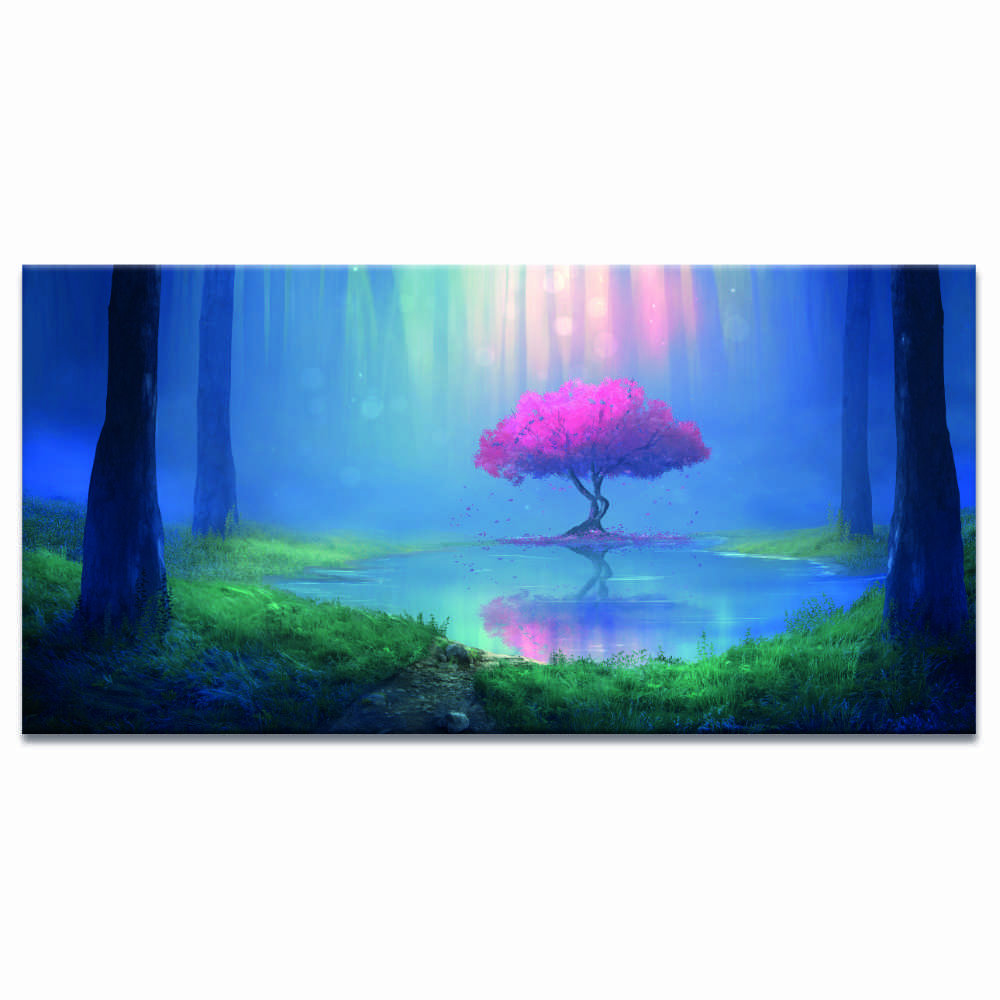 Trae un toque de naturaleza a tu casa con este precioso cuadro moderno para el salón de un árbol rosa junto a un lago en medio del bosque.