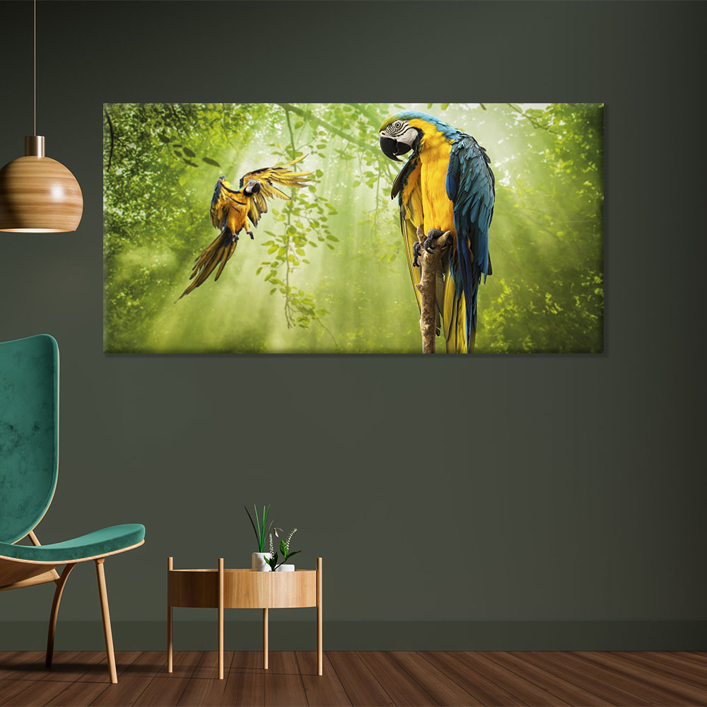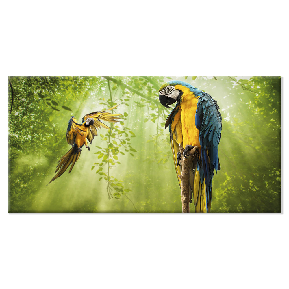 Estos dos loros parecen divertirse en la jungla, territorio de muchos animales. Este moderno cuadro de salón nos transmite toda la energía de esta enorme selva tropical!