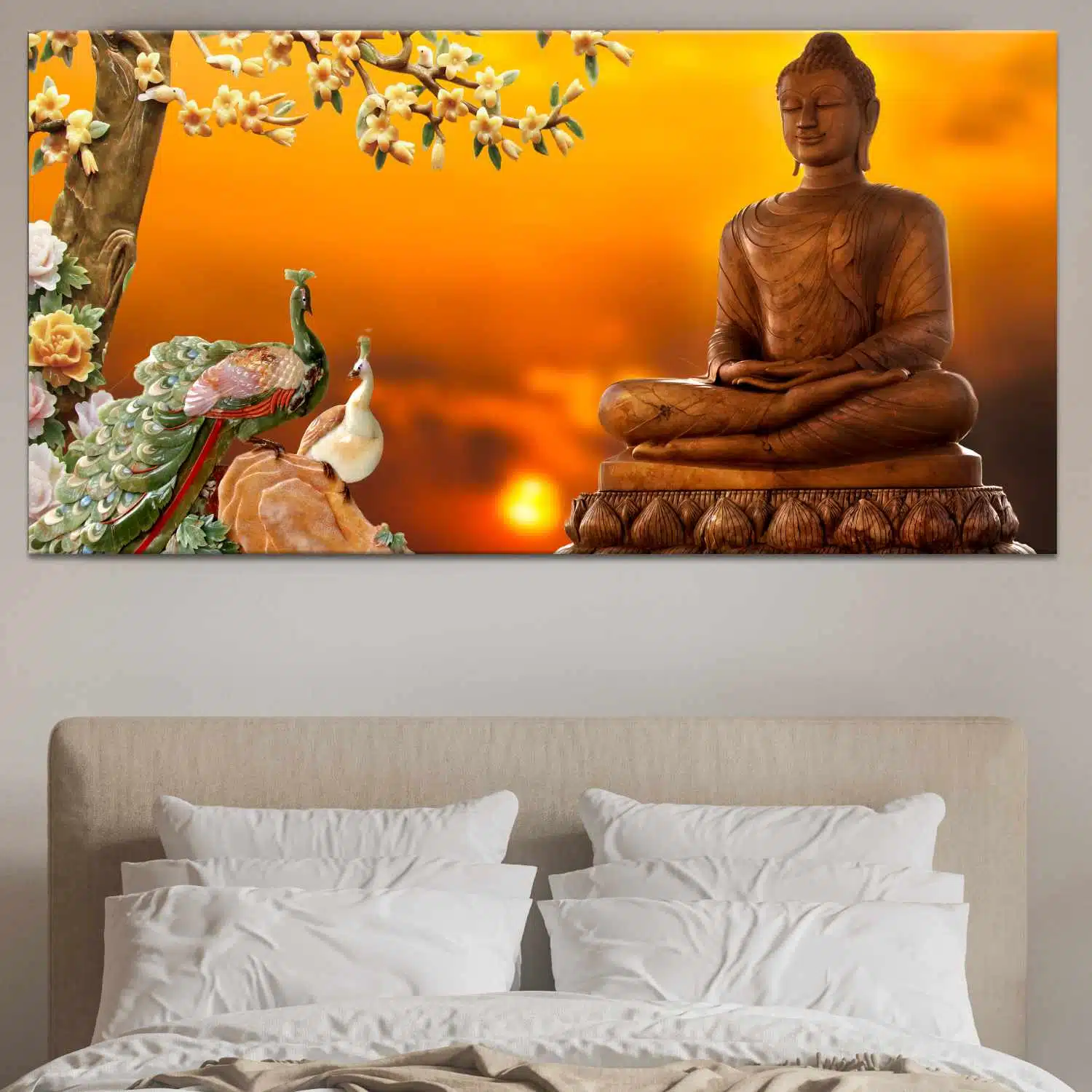 Este moderno cuadro de salón representa una estatua de Buda junto a dos pavos reales que simbolizan la apertura y la aceptación durante el atardecer.